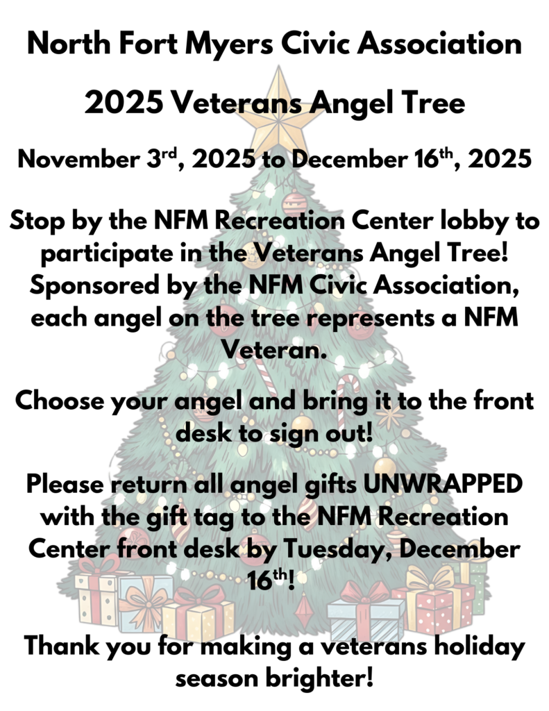 Join the North Fort Myers Civic Association this Holiday Season by participating in our Veteran Angel Giving Tree. Each Angel represents a veteran within North Fort Myers.